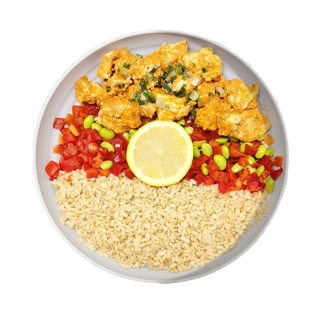 Ingrédients: Poitrine de poulet, riz brun, oignon vert, edamame, piment rouge doux, ail, vinaigre, sauce poulet au beurre, huile d'olive extra vierge, citron, épices et sel de mer.