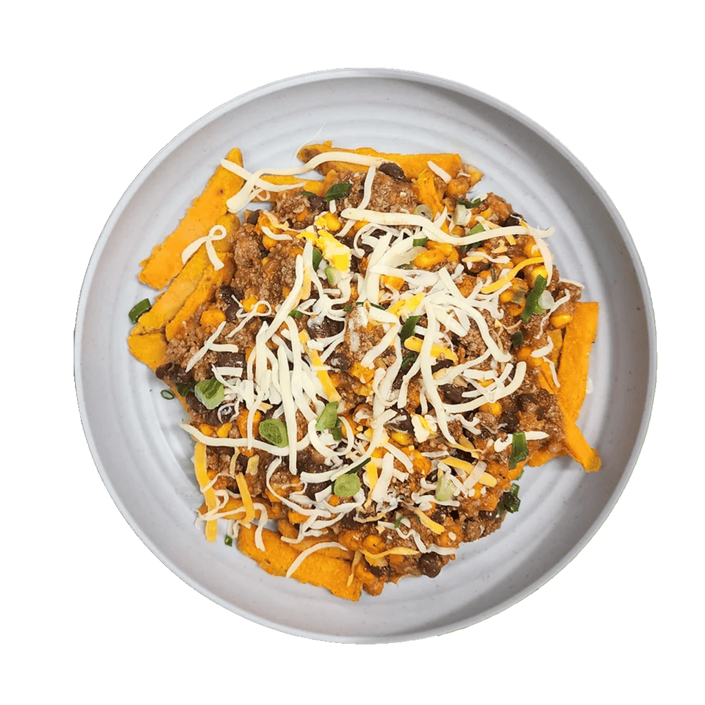 Ingrédients: Boeuf haché extra-maigre, bâtonnets de patate douce, haricot noir, maïs, fromage mozzarella et cheddar, oignon, ail, sauce tomate, sauce épicée, oignon vert ,sel de mer et épices.