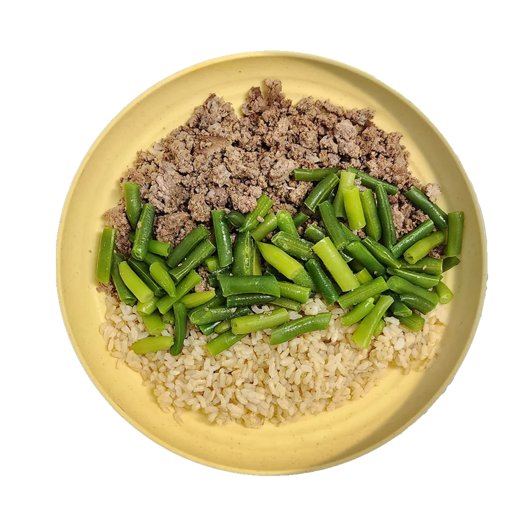 Ingrédients: Boeuf hachée extra-maigre, onion, ail, riz brun, haricot vert, huile d’olive, sel de mer, poivre noir et épices.