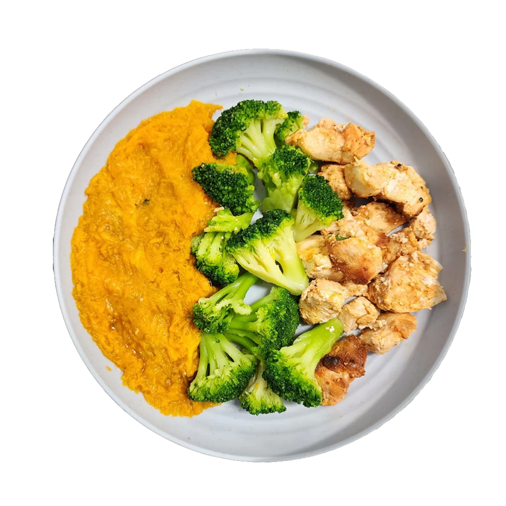 Ingrédients: Poitrine de poulet, patate douce, brocoli, ail, vinaigre, sel de mer, poivre noir et épices.