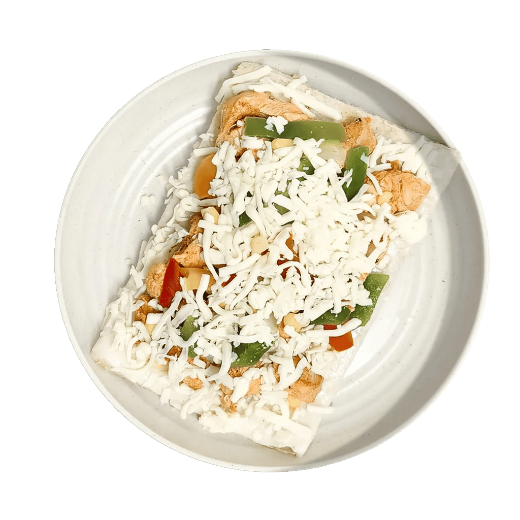 Ingrédients: Poitrine de poulet, pain de blé entier [Blé entier, sel, levure, propionate de calcium], fromage mozzarella, sauce alfredo, maïs, poivrons, oignon, huile d'olive extra vierge, ail, sel de mer et épices.