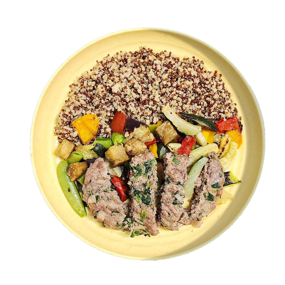 Ingrédients: Boeuf hachée extra-maigre, quinoa, aubergine grillée, poivrons rouge et jaunes, haricots verts, courgette, oignons d'Espagne, sel de mer, poivre noir et épices.