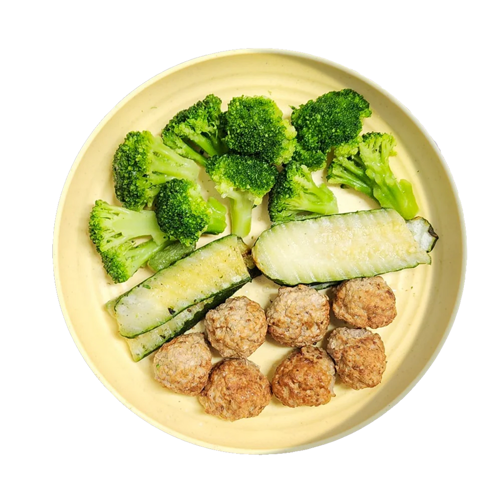 Ingrédients: Boeuf haché, brocoli, courgettes grillées, sel de mer, poivre noir, paprika, poudre d’oignon, poudre d’ail, poivre blanc, huile d’olive et épices.