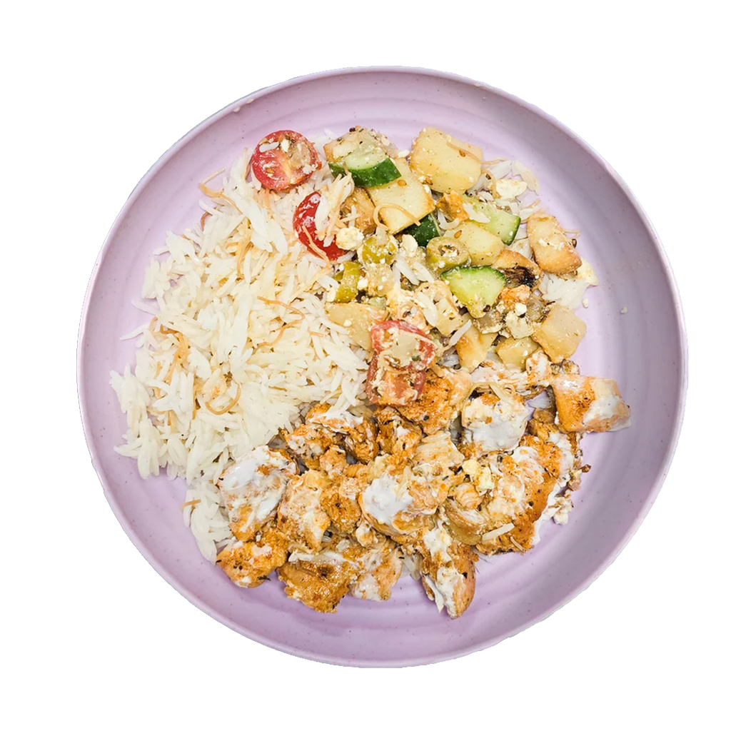Ingrédients : Poitrine de poulet, riz blanc, pommes de terre en cubes, vermicelles, concombres, tomates, olives, fromage feta, yogourt grec, oignons, citron, huile d'olive, ail, zaatar, épices et sel de mer.
