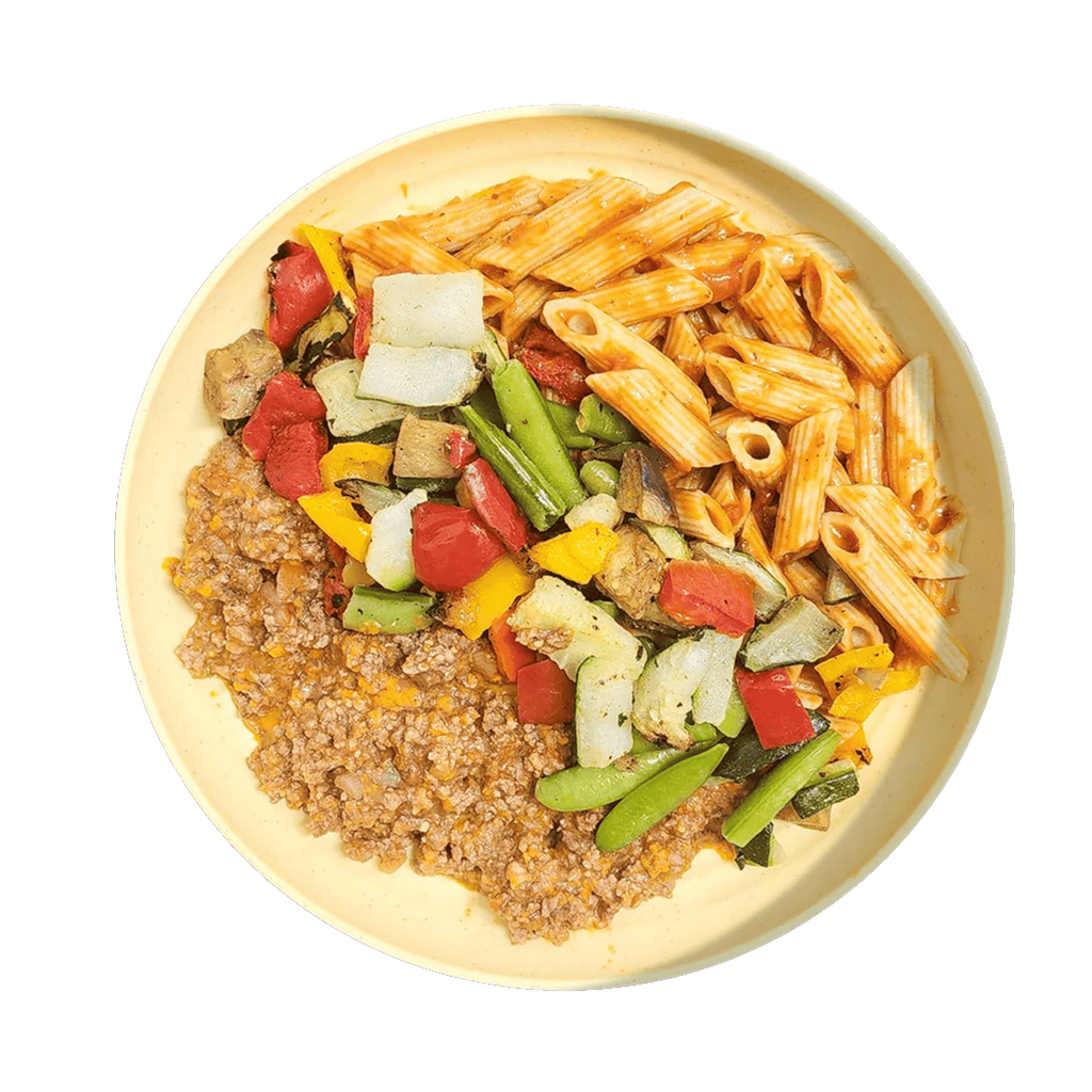 Ingrédients: Bœuf haché extra-maigre, penne à grains entiers, courgettes grillées, pois mange-tout, aubergines, poivrons rouges, sauce tomate [Purée de tomates, sel, poudre d’oignons, acide citrique, poudre d’ail et épice], ail, onion, sel de mer, poivre noir et épices.