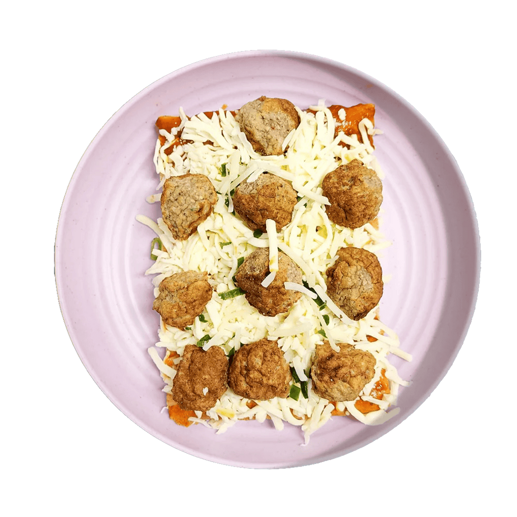 Ingrédients: Boeuf haché extra-maigre, pain blé entier [Blé entier, sel, levure et calcium propionate], fromage parmesan, fromage mozzarella, sauce tomate, oignon vert, épices et sel de mer.