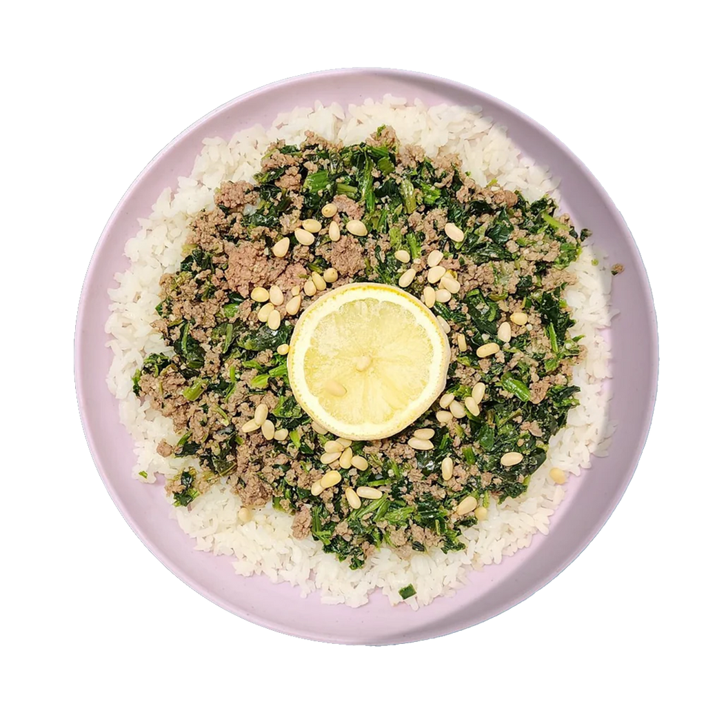Ingrédients: Boeuf haché maigre, riz blanc, épinards, ail, onion, citron, pignons de pin, sel, poivre, huile d'olive.