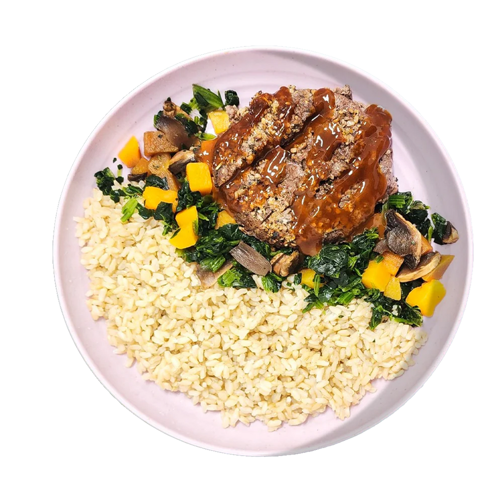 Ingrédients: Boeuf haché extra-maigre, riz brun, champignons, courges, épinard, sauce bbq [Tomates broyées, vinaigre de cidre, vinaigre blanc, amidon de maïs modifié, sel, oignon déshydraté, colorant caramel, concentré de jus de citron, épices, arôme naturel, ail en poudre, fumée de caryer, gomme de xanthane, sucralose], huile d'olive extra vierge, sel de mer, poivre noir et épices.